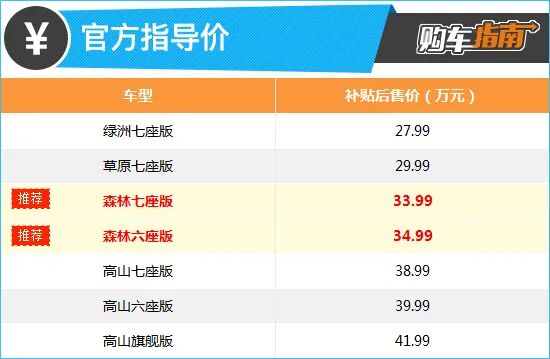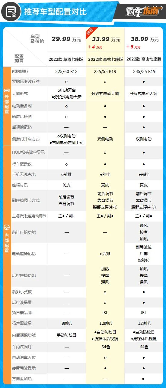 至于高一档的高山七座版来说,多出的5万元仅在舒适性配置上有所体现,例如方向盘加热、HUD抬头数字显示,同时还把一些选装配置变成了标配,对于日常使用来说,没有太多实质性帮助,所以多出的价格与配置相比并不太值,因此还是推荐的森林版七座车型性价比更加出众。