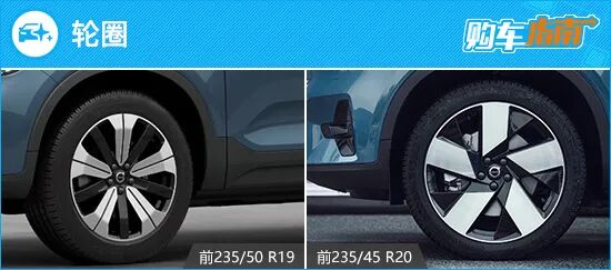 沃尔沃C40提供19英寸和20英寸两种规格的轮毂供大家选择,19英寸为多辐样式,20英寸为五辐低风阻样式(如上图)。作为一台强调运动和操控的车型,沃尔沃C40的后轮统一是要比前轮更宽,19英寸轮毂匹配前235/50 R19,后255/45 R19的轮胎;20英寸轮毂匹配前235/45 R20,后255/40 R20的轮胎。不用想,20英寸轮圈肯定是要选装的。