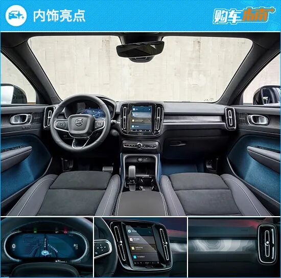 内饰层面依旧是大家都非常熟悉的沃尔沃经典风格,设计没新意但细节有惊喜。沃尔沃C40首次导入了沃尔沃100% Leather Free理念,门板内衬、座椅、方向盘等均没有采用动物制皮,而是大面积可再生环保材质,但无论是视觉还是触感都不落档次,心里的满足感还是挺强的。车机部分包括科大讯飞语音识别、华为应用市场、OTA软件升级都有支持,跟得上当下主流,满足日常使用没有问题。