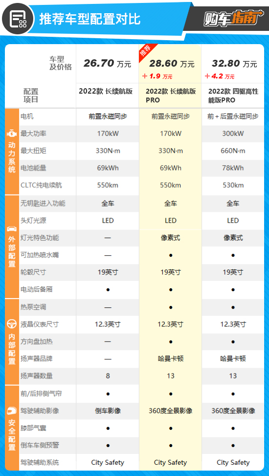 长续航版PRO是最推荐购入的选择,对比长续航版,13扬声器哈曼卡顿音响的加入无异于让车内的听觉体验提升了不止一个档次,听歌剧、听流行、听美声,体验都非常出色,相信沃尔沃车主的耳朵还是非常挑剔的,一套豪华音响必不可少。此外新增的重点配置就是方向盘加热,冬季驾驶时的舒适体验明显提升。其实就这两项已经完全值回了从长续航版升级到长续航版PRO所需的1.9万元差价,而剩下的配置几乎等于白送,难道不香吗?