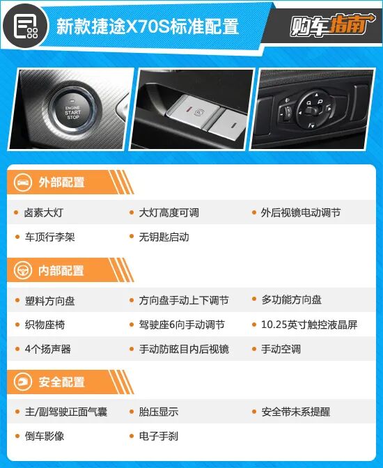 2022款捷途X70S定位为中型SUV,其入门车型1.5T-6MT芳华版售价仅为8.79万元,单从价格来看,入门车型优势较大。不过,具体配置方面,入门车型却谈不上出色,特别是在安全性配置上,入门车型是全系唯一一款没有配备ESP车身稳定系统的车型,并且像实用性较强的自动驻车和上坡辅助也没有提供。相比之下,入门车型在多媒体方面表现不错,全系均配备了10.25英寸悬浮式中控屏,内置最新版本的车机系统,只是入门车型仅提供了4个扬声器。虽然价格比较有诚意,不过入门车型在关乎行车安全的配置上有明显缺失,故不做推荐。