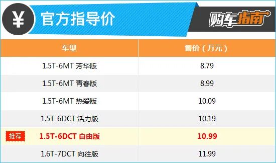 在两款搭载1.5T发动机的自动挡车型中,更推荐您考虑售价为10.99万元的高配车型1.5T-6DCT自由版。价格来看,推荐车型仅比手动挡最高配贵了9000元,却得到了18英寸运动轮圈、定速巡航、远程启动、皮质方向盘、主驾座椅6向电动调节、后排座椅中央扶手及杯架等实用配置,再配合6速双离合变速箱,在驾驶舒适性和燃油经济性方面都有着不错的表现。