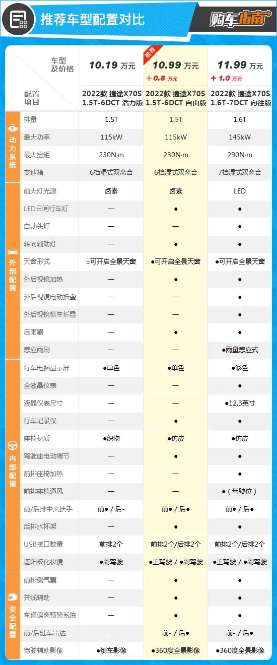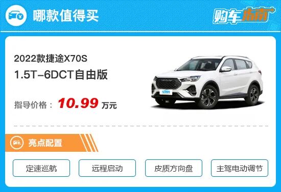 至于顶配车型1.6T-7DCT向往版,其售价已经接近12万元大关,虽然搭载了动力更强的1.6TGDI发动机,不过油耗也相对更高。配置方面,与推荐车型相比,顶配车型实质性提升比较有限,增加了科技感更强的12.3英寸全液晶仪表、座椅通风、座椅加热等舒适性配置,这些配置对于日常使用影响不大。因此,综合价格以及日常实用性等因素,售价合理且配置相对较高的1.5T-6DCT自由版性价比更具优势,建议在购买2022款捷途X70S时优先考虑。