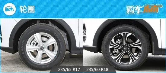 2022款捷途X70S提供了两种尺寸的轮圈,其中手动挡车型采用17英寸五辐轮圈,对应轮胎规格为235/65 R17,轮胎扁平比较高,注重舒适性;自动挡车型配备的是18英寸双色轮圈,造型更加运动,对应轮胎尺寸为235/60 R18,追求均衡性表现。