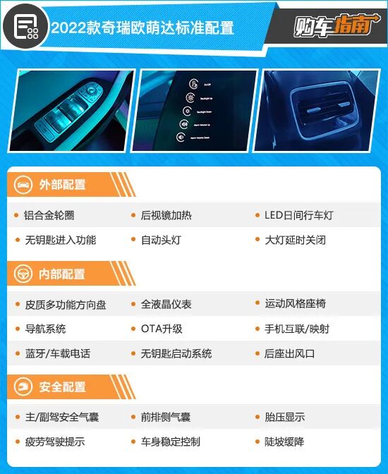 奇瑞欧萌达入门车型为1.5T+CVT元界版,起售价为9.29万元,该车配备了无钥匙进入、全LED大灯、倒车影像以及定速巡航等功能。在娱乐配置方面,例如车联网、OTA升级、手机互联/映射以及语音交互均有配备,可以说该车基础配置并不低,但是在舒适性配置上有所欠缺。如,座椅为皮/织物混搭材质,副驾驶座椅和空调也为手动调节。此外,该车也没有配备天窗以及后排中央扶手,对后期使用方面不免造成一定影响,因此并不适合推荐。