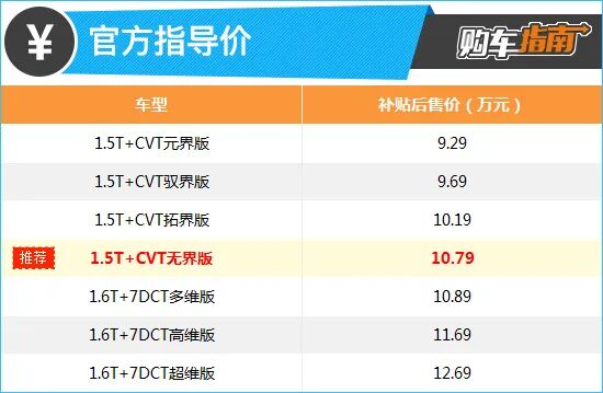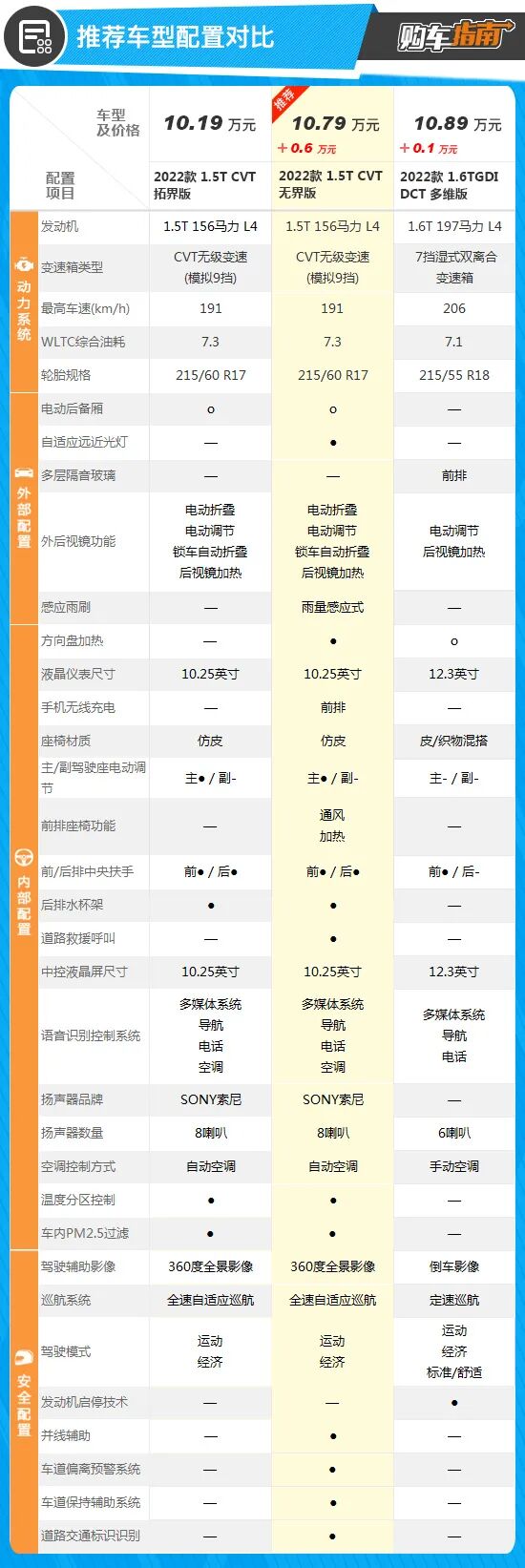 对于1.6T车型来说,其在动力表现上有了大幅提升,但是从配置上来看,比推荐车型多1000元的1.6T入门版车型虽然在动力上有一定优势,但在配置上较推荐车型有不少缺失,特别是一些舒适性和安全性配置。而在1.6T高配车型上,虽然配置全面,但是价格也随之上涨,整体性价比优势略有下降,所以有需要买1.6T车型的朋友可以依照自己需求来购买就好。综合来看,推荐的1.5T CVT无界版在配置以及性价比方面表现出色,购车时可优先考虑。