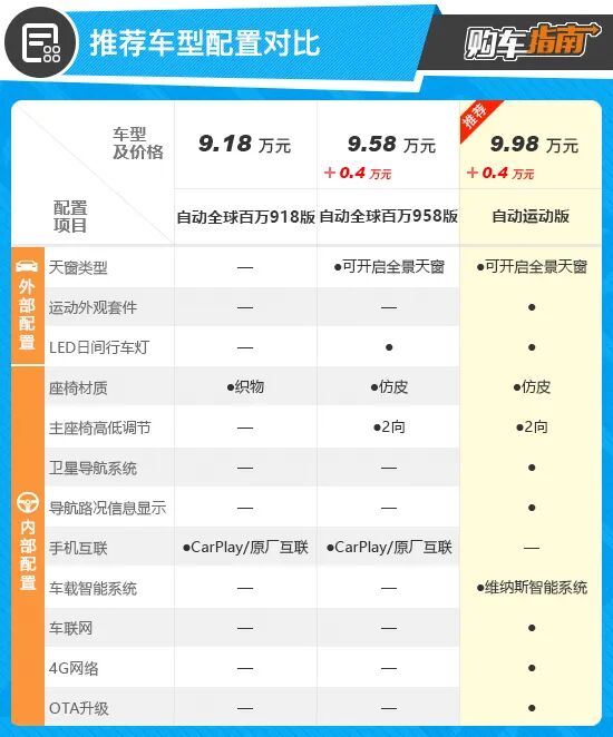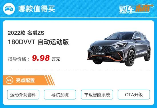 针对2022款名爵ZS车型,推荐售价为9.98万元的自动运动版,即全系顶配车型。理由其实非常简单,首先是作为车系中唯一的“运动版”车型,针对外观设计方面的升级调整可以说是特别对味儿,前卫动感,颇为惹人喜爱。另外在配置层面,推荐车型相较次顶配车型也有着不少提升,别看差价只有4000元,但是例如卫星导航系统、导航路况信息显示、维纳斯智能系统、车联网以及OTA升级,却都是推荐车型独有的专属配置,在实用性以及科技感方面均有着上佳表现。综上所述,对于2022款名爵ZS车型的购买建议,个人认为还是售价为9.98万元的自动运动版车型性价比最高,消费者在选择时可以优先考虑。