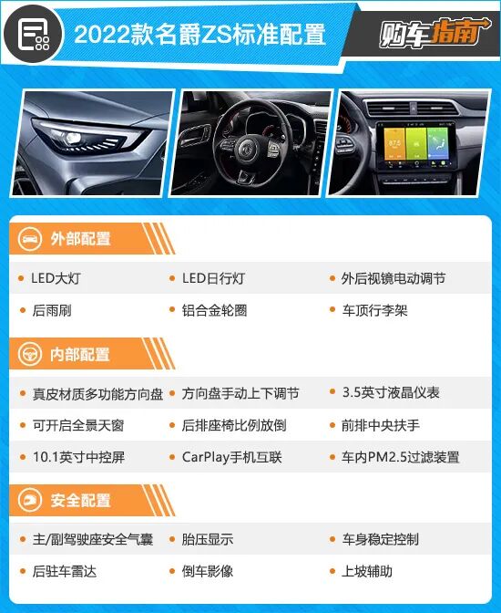 2022款名爵ZS入门版车型为手动全球百万858版,售价8.58万元。如果仅从配置的角度来看,这款车型的表现确实可圈可点。例如可开启全景天窗、真皮材质多功能方向盘、3.5英寸液晶仪表、10.1英寸中控屏、手机互联、语音识别控制以及车内PM2.5过滤装置等,均有所搭载,达到了同级别主流水平。