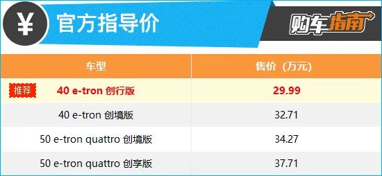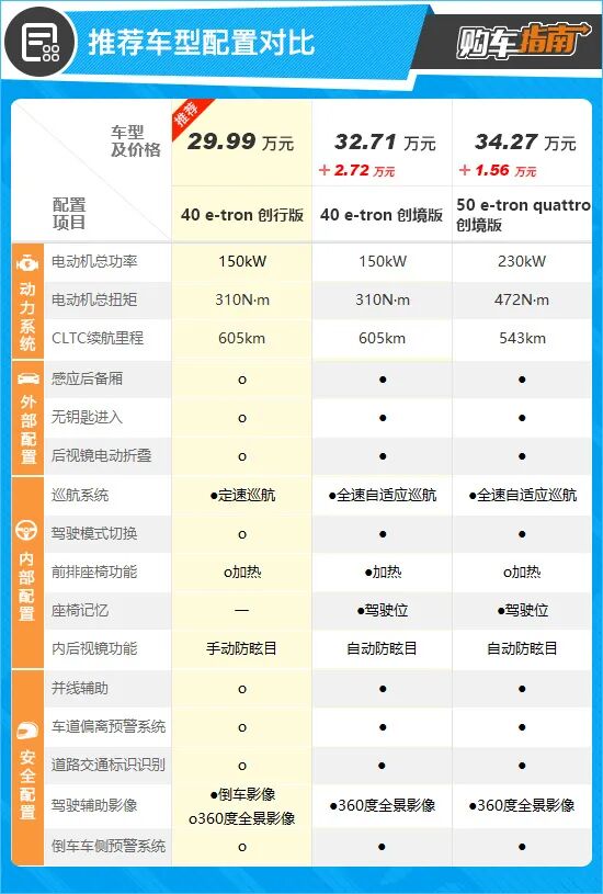 与燃油版车型一样,奥迪纯电动系列产品中,每款车型的主要差异其实还是在一些便利性或舒适性的高阶配置上,奥迪Q4 e-tron也不例外。值得一提的是,即便是入门版推荐车型,也提供了与高一级别车型相同配置的选装机会,因此消费者可以根据自身需求进行选装,例如座椅加热、无钥匙进入系统、SONOS音响这三项年轻人倾向的配置,选装价总和也不过才1万元出头。按需选装的优势在于,在保证日常使用需求的前提下,可以最大程度提升性价比。