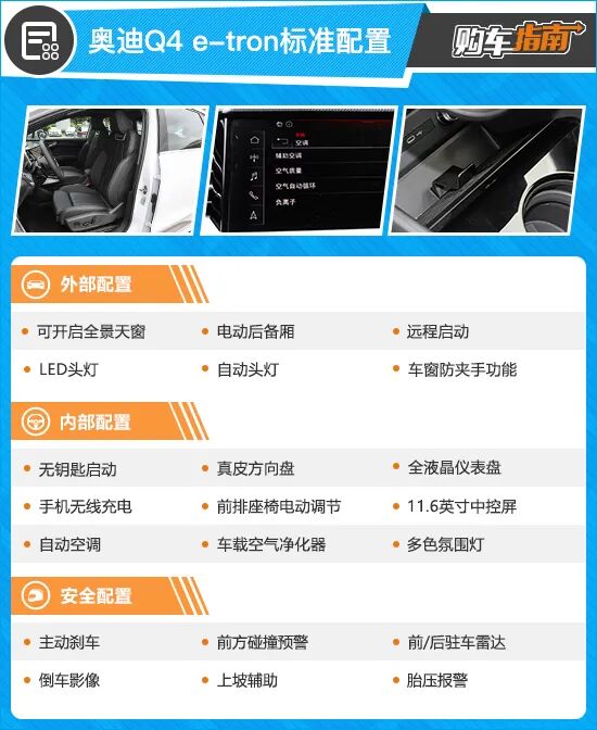 奥迪Q4 e-tron入门车型配置可谓相当厚道,外部配备了国内消费者喜闻乐见的可开启全景天窗,同时还配备电动后备厢、LED头灯、远程启动以及自动头灯等便利性配置。车内则配备无钥匙启动、前排座椅电动调节、自动空调、车载空气净化器等,且当下较为流行的多色氛围灯和手机无线充电也有所配备。安全配置方面虽然不算特别丰富,但主动刹车、前方碰撞预警、前/后驻车雷达以及倒车影像等主流功能还是有所配备的,足以应对日常使用场景。因此综合来看,奥迪Q4 e-tron入门车型绝对是值得入手的车型。