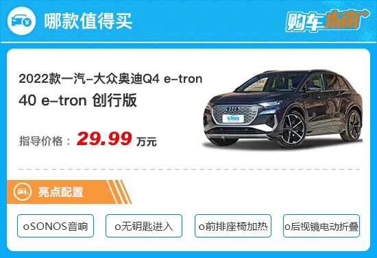 7月21日,一汽-大众奥迪全新紧凑型SUV——奥迪Q4 e-tron正式上市,此次共推出4款车型,售价区间为29.99-37.71万元。与此同时,即日起至2022年9月30日下订用户可享受限时权益,包含36期0息金融产品、8年免费救援(订单满1000开启)、4年免费充电(每年1500度充电额度)、3年免费车联网服务及流量以及8年或16万公里三电质保等;10月1日-12月31日,用户还可享受畅享权益。具体活动请咨询经销商。