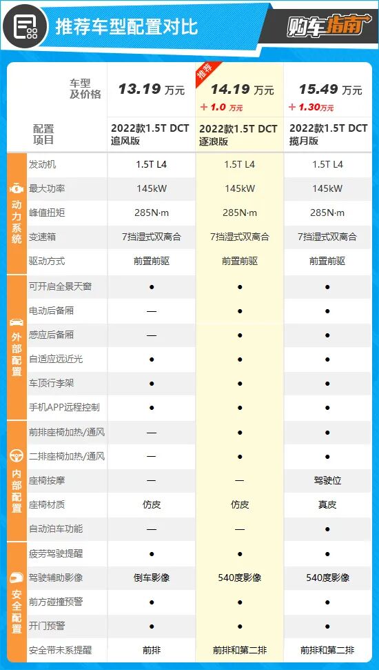 最后,对比揽月版,也就是全系顶配车型,揽月版较推荐车型主要增加了驾驶位座椅按摩、真皮座椅、自动泊车等配置,更多起的是锦上添花的作用,而且需要再增加1.3万元预算,性价比不高。综上,直接选择逐浪版是性价比最高的方案,购车时可优先考虑。