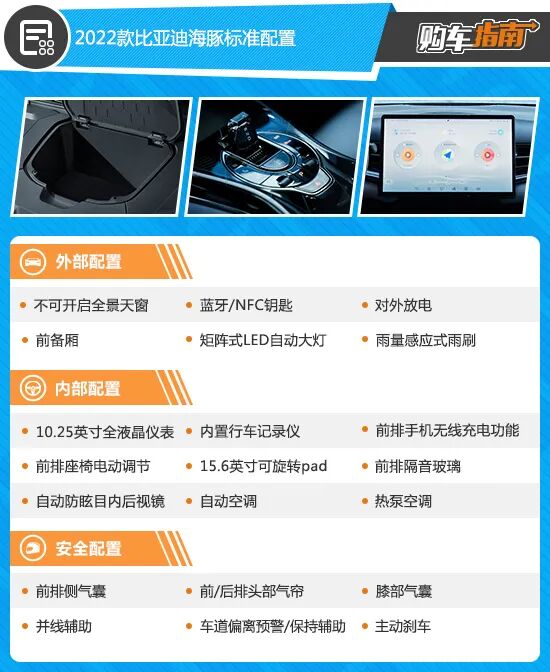 2022款比亚迪海豹毕竟起售价已经突破了20万元,所以即便入门车型也有着非常全面的配置表现。如矩阵式LED光源自动大灯、全景天幕、支持蓝牙和NFC的无钥匙进入/启动、无线充电、10.25英寸全液晶仪表以及比亚迪招牌的15.6英寸可自适应旋转的多媒体触控屏,均有所配备,可以说已经能为大部分家庭用户提供相当不错的实用和便捷体验。