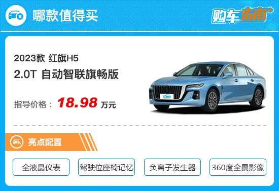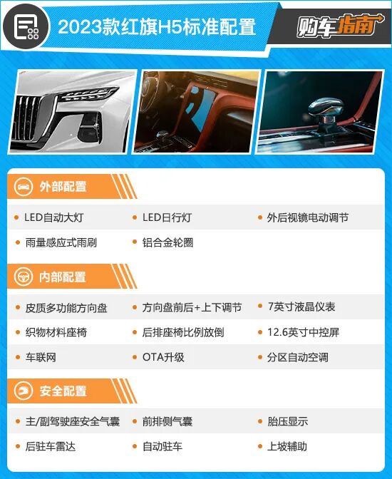 2023款红旗H5的入门版车型为1.5T 智联旗悦版,售价15.98万元。客观来说,这款车型的性价比表现并不差,而且对于该有的基础配置也都没吝啬,例如LED自动大灯、雨量感应式雨刷、多功能方向盘、12.6英寸中控屏以及分区自动空调等,完全可以满足日常使用。之所以不做推荐,主要还是基于车辆定位而言,配置标准不能仅满足于“够用”的水平,而且1.5T+7速双离合变速箱的动力配置,对于这样一款中型车来说也确实略显寒酸。