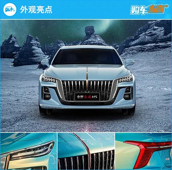 外观方面,新车采用了红旗标志性的大尺寸“直瀑式”进气格栅设计,内部搭配粗壮的镀铬装饰条以及中间位置的红色点缀,给人一种强烈的稳重感,整体气场颇为强大。分体式大灯前卫个性,其中,上方的LED日间行车灯带与进气格栅融为一体,而下方的远/近光灯组则是内嵌于前包围两侧,非常有新意。