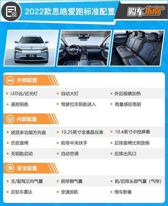 从配置层面来看,思皓爱跑入门版车型提供了后驻车雷达、倒车影像、定速巡航、全液晶仪表盘、LED远近光灯、外后视镜加热、自动头灯、自动空调等一系列配置,基本可以覆盖到日常生活中常遇的大部分场景,显的十分具有性价比。不过,该车并未配备天窗以及后排座椅中央扶手,这对于一台轴距和空间更占优势的车型来说,定位有些许偏移。而如果要选择一款车型更符合其定位,我认为非一马当先版莫属,毕竟第二代蜂窝电池、“三合一”电驱系统、热泵空调、华为智慧助手以及科大讯飞智能语音系统都配备了,更能体现智能化的驾驶辅助系统方面没有真本事怎么能行。