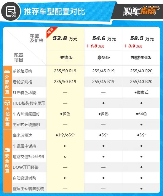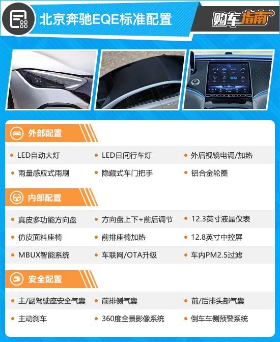 对比配置来看,就日常使用而言,无论实用性、舒适性还是进阶的科技配置,入门的先锋版本车型就已经完全能够满足绝大部分消费者的使用需求,而且其752km的续航里程也要略优于另外两款配置车型,非常实用。豪华版车型较推荐车型贵了1.8万元,而配置方面的提升却无非只有HUD抬头数字显示、5个毫米波雷达以及车道居中保持等几项主动安全系统,对于日常使用的便利性并不会带来显著提升,因此意义不大。至于顶配的先型特别版车型,则更是不建议选择,虽然售价高达58.5万元,但是其独享的配置不过只有像素式LED大灯、车内主动环绕式照明系统、DOW开门预警以及整体主动转向系统,即便购车预算相当充足,也完全犯不上把钱花得这么没有“性价比”。综上所述,对于2022款北京奔驰EQE车型的购买建议,个人认为还是售价52.8万元的先锋版性价比最高,消费者在选择时可以优先考虑。