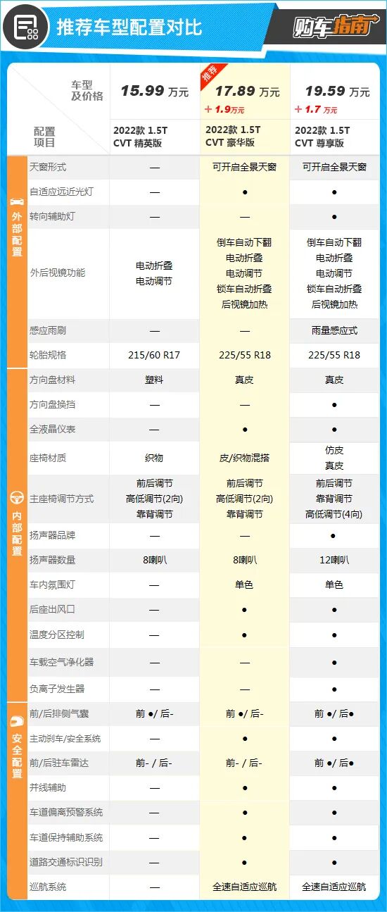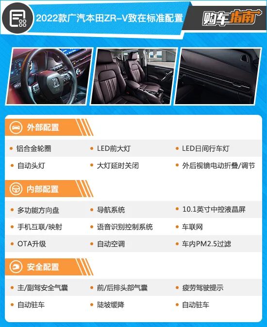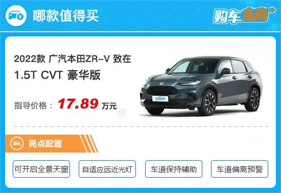 2022款广汽本田ZR-V 致在入门车型为1.5T精英版,起售价为15.99万元,从配置上来看,该车外部以及内部配置比较基础,例如无钥匙进入、全液晶仪表、自适应远近光灯、后座出风口以及温度分区控制均没有配置。而消费者最为关心的安全方面,入门车型整体表现也比较一般。总的来说,结合接近16万元的价格,入门车型的配置确实有些“寒酸”,因此不做推荐。