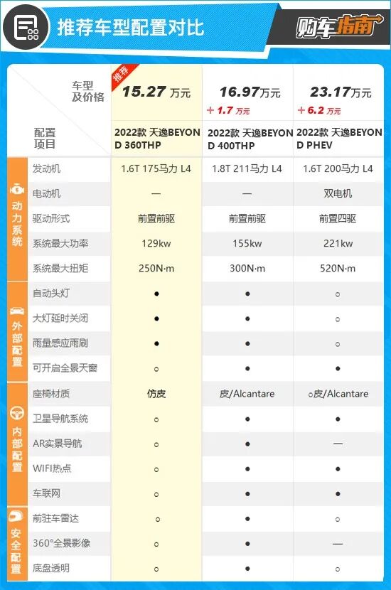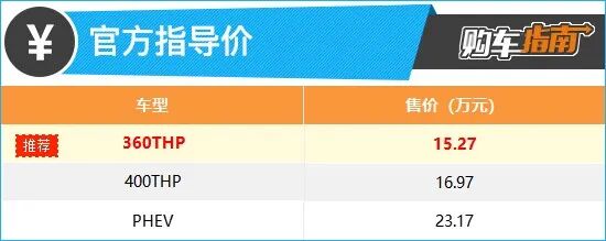 至于PHEV车型的售价则是足足比入门版本推荐车型高出了7.9万元,尽管动力水平有很大提升,但配置提升却微乎其微,这显然不足以成为您购置PHEV车型的理由。因此,综合对比来看,360THP版车型性价比最高,大家在购车时可优先考虑。而如果您对插混车型不是刚需,那么实在没有升级的必要。