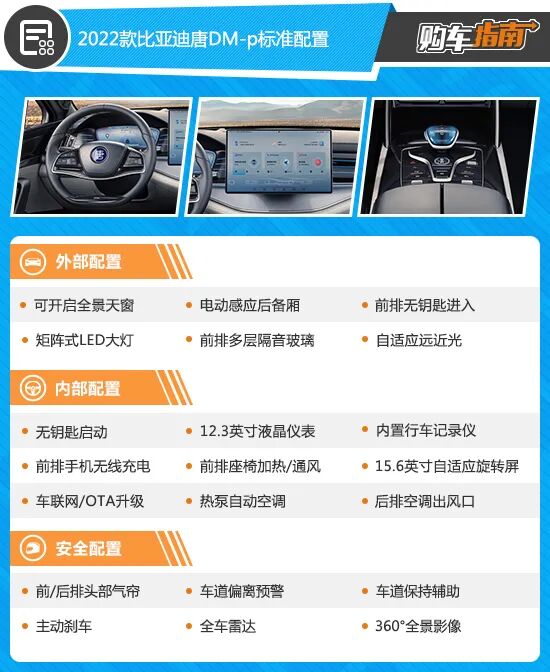 2022款比亚迪唐DM-p作为高性能车型,起售价达到了28.98万元,所以即便是最低配车型,配置表现也非常全面。如矩阵式LED光源自动大灯、前排座椅加热/通风、可开启全景天窗、支持蓝牙和NFC的无钥匙进入/启动、前排无线充电、12.3英寸全液晶仪表以及比亚迪招牌的15.6英寸自适应旋转触控屏等,均悉数到场,对于一般家庭用户来说,配置表现甚至可以用过剩来形容。