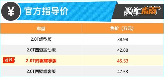 全系顶配车型2.0T 四驱耀奢版的售价都达到47.53万,其实相比推荐车型的配置水平并没有太大幅度的提升,诸如矩阵式LED大灯更多属于锦上添花的配置,个人觉得没有太大必要,性价比不高。综上,2.0T四驱耀享版是车质网最推荐给您的选择,购车时可以优先考虑。