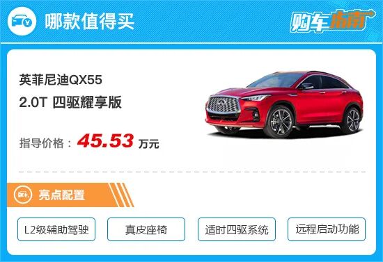 英菲尼迪一直是我心目中很有调性的品牌,不从众,产品设计风格独树一帜;重视品质,不忽略对每个对驾乘人员有影响的座舱细节,更准确的说,有一种匠人精神。此次英菲尼迪在2022成都车展上也带来了旗下首款轿跑SUV—QX55,整车进口品质、全新溜背轿跑设计风格、除入门车型外标配四驱系统,意在为想购入一台高品质运动SUV的人群而来。新车刚上市,买哪款车型最有性价比?本期《购车指南》告诉你。