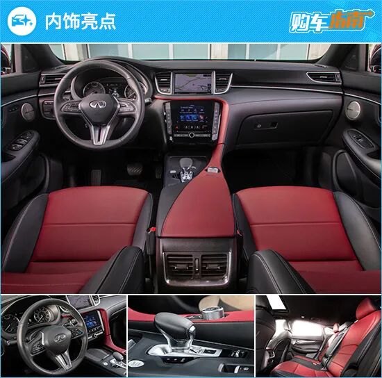 内饰方面,整体和英菲尼迪QX50的布局差异不大,以当下的标准来看,具有一定的年代感,内部功能操作多以手动为主,贯彻以实用为主的造车理念。中控采用了较为独特的上下双屏布局,并配备了三幅式多功能真皮方向盘、传统机械式仪表盘以及造型小巧的电子挡把,操作简单易上手。另外,内饰整体红黑双拼的配色,中控台、门板内衬大面积的半苯胺皮革、开孔木质装饰等高端用料,也彰显了英菲尼迪QX55的运动豪华感。