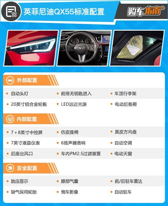 2.0T耀型版是英菲尼迪QX55的入门车型,售价为38.98万。说实话,价格到达一定层级了,配置水平肯定能有一定保障,2.0T耀型版的基础配置还算全面,前/后驻车雷达、前排无钥匙进入、真皮多功能方向盘、电动后备厢等都有,满足日常没有问题。但最大的问题,都快花到40万了,一点豪华体验的配置都没有,另外这台2.0T耀型版也是全系当中唯一搭载低功率调校发动机和不配备四驱系统的车型,所以购入这台2.0T耀型版,更像是对品牌的狂热支持,综合而言性价比太低。我的建议,还是多花一些预算看看高配车型。