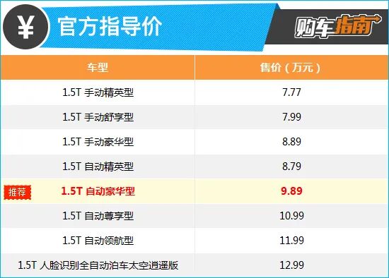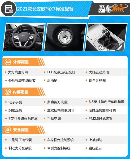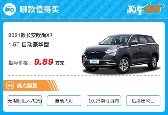 此次我们推荐的是1.5T 自动豪华型,考虑到自动挡车型的适用范围更广,而且能够真正有效地缓解驾驶疲劳,所以手动挡车型并不做推荐。通过对比配置单不难发现,推荐车型比低一档次的自动精英型多出了不可开启全景天窗、无钥匙进入/启动、皮质包裹方向盘、10.25英寸多媒体触控屏以及全车车窗一键升降等功能,能够有效提升日常用车的便利性。特别是全景天窗的加入,这项配置后续很难单独进行加装。此外,推荐车型的座椅也升级为仿皮材质,同时还增加了后排空调出风口,整体舒适性体验要高于精英型,且两者之间的差价仅为1.1万元,显然推荐车型更具性价比。而与更高一级别的自动尊享型相比,推荐车型与其差价同样为1.1万元,但所增加的全液晶仪表、GPS导航以及自动空调等功能,并非这个级别车型消费人群的刚需,对日常用车来说达不到质的提升。所以综合来看,2021款长安欧尚X7的1.5T 自动豪华型性价比最高,且指导价没有超过10万元,在购买时可优先考虑。