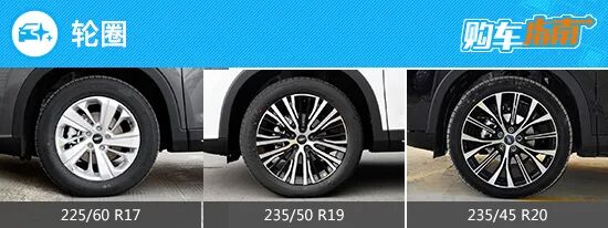 2021款长安欧尚X7全系提供了三款轮圈,其中,精英型和舒享型均为类似“旋涡”造型的双五辐式17英寸轮圈,具体轮胎尺寸为225/60 R17。豪华型和尊享型则配备了双色多辐式轮圈,具体轮胎尺寸为235/50 R19。而顶配和次顶配车型同样配备了双色多辐式轮圈,但造型更有力量感,同时尺寸也更大,为20英寸,具体轮胎尺寸为235/45 R20。