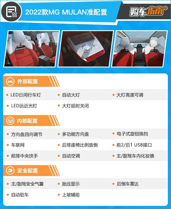 安全方面,MG MULAN入门车型相对表现一般,该车在被动安全方面只配备了主/副驾安全气囊,其它气囊均没有配备,所以无法对驾乘人员提供足够的保护。整体来看,2022款MG MULAN入门车型虽然在外观和内饰部分配置还算可以,但是安全配置上无法对驾乘人员提供足够的保护,因此故不作为主要推荐车型。