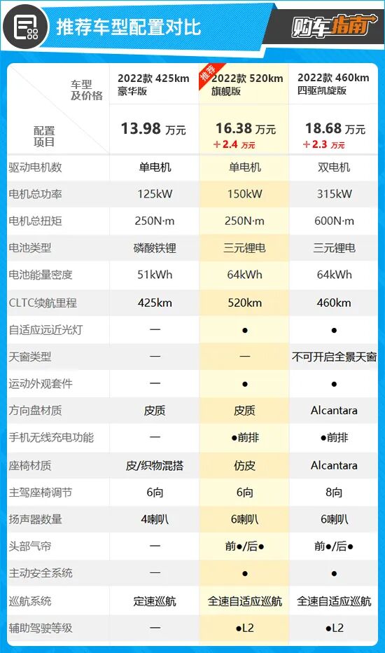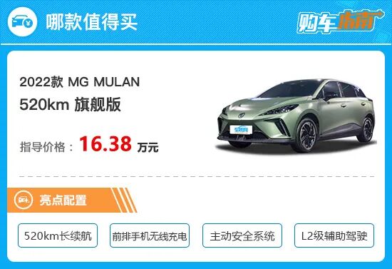 综合配置信息,向您推荐2022款MG MULAN 520km 旗舰版车型。作为一款次顶配车型,该车在配置上完全可以满足一款家用代步车的需求,同时价格也保持在一个相对适中的区间内。而之所以推荐次顶配车型,主要是因为该车搭配了一块64kWh的三元锂电池,最大里程里程可以达到520km,相比于入门级和次低配车型续航要长不少,更何况配置部分也有所提升。而对于入门级和次低配车型,400多的续航里程放在当今,根本无法满足正常消费者的用车需求,就凭这一点425km续航车型不做优先推荐。