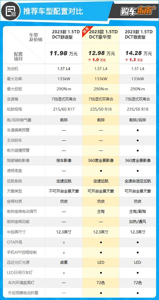 而在当下年轻用户更在意的智能化体验方面,推荐车型的车机支持OTA升级,也意味着功能体验能持续更新,始终享受主流功能。此外,推荐车型还支持手机APP远程控制,日常用车更便捷。综合来说,从舒适型升级到豪华型的这一万元预算,物有所值,性价比突出。