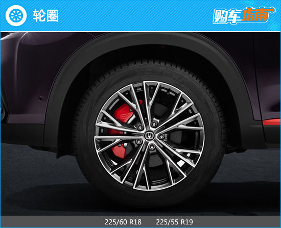 2023款长安CS85 COUPE全系提供了两种轮圈尺寸,入门车型为18英寸,其余车型为19英寸。同时多辐式轮圈设计搭配红色刹车卡钳也颇具性能感。