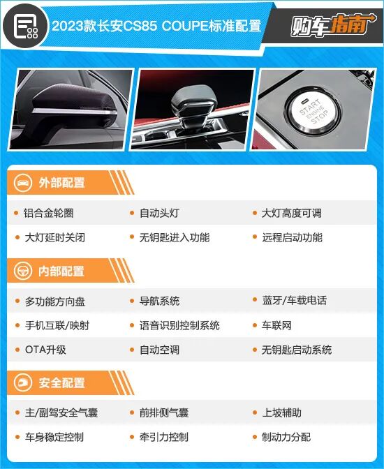 2023款长安CS85 COUPE的入门车型为1.5T自动精英型,该车售价为11.99万元,这样的价格能买到一款中型SUV的确很有吸引力。在基础配置层面,诸如自动头灯、大灯延时关闭、远程启动以及无钥匙进入、无钥匙启动等,保障了日常用车需求。不过对于日常使用较多的LED大灯、电动后备厢、外后视镜电动折叠以及车内空调分区控制等却有所缺失,同时1.5T的动力对于一台中型SUV来说只能说是中规中矩,综合来看,入门版车型仅仅适合预算不高且对配置没有过多要求的消费者。