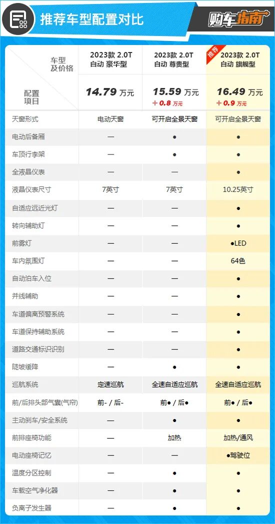 在其他配置方面,液晶仪表顶配车型为10.25英寸,其余车型均为7英寸;中控液晶屏尺寸入门车型为10英寸,其余车型均为12.3英寸。在座椅方面,新车全系配备了皮质座椅整体乘坐舒适度较高,在功能上,2.0T自动尊贵型以及2.0T自动旗舰型支持主/副驾驶座电动调节功能,而其余车型均为主驾驶电动调节。