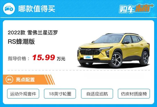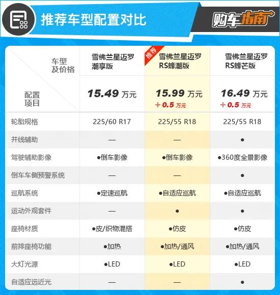 除了RS运动外观套件之外,单就配置层面来看,其实RS蜂潮版的性价比也并不算低。相较低一个配置的潮享版,推荐车型升级了18英寸轮圈和自适应巡航,此外仿皮材质座椅以及前排座椅通风的加入,无论在品质感还是乘坐舒适性方面,也都有着明显进步。如此看来,5000元的差价其实完全可以接受。顶配的RS蜂芒版售价来到了16.49万元,虽然相比推荐车型贵了5000元,但是配置提升却并不明显,像是并线辅助、360度全景影像以及自适应远近光,吸引力着实有限。综上所述,对于雪佛兰星迈罗车型的购买建议,个人认为还是售价15.99万元的RS蜂潮版性价比最高,消费者在选择时可以优先考虑。