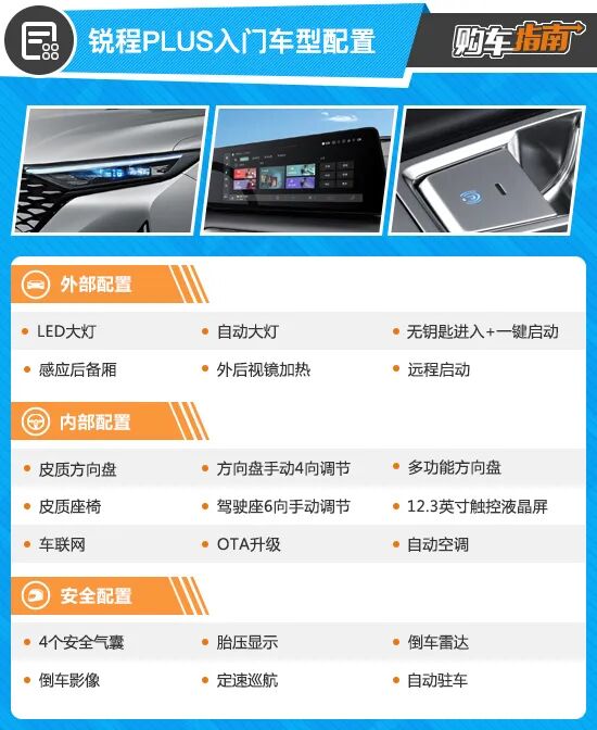 锐程PLUS的入门车型自动豪华型价格成功控制在10万元以内,同时整体配置水平也并不寒酸,尤其是在日常使用频率较高的多媒体、空调以及外部功能配置方面,入门车型表现不错。全系标配12.3英寸中控显示屏,内部集成了高德导航、智能语音控制以及车联网等功能,并且支持OTA升级。此外,诸如自动空调、自动大灯、无钥匙进入+一键启动、远程启动、感应后备厢等实用性功能均为全系标配,满足日常使用完全没有问题。不过,在安全性和舒适性配置方面,入门车型仅配备了4个气囊以及普通的定速巡航,包括IACC集成式自适应巡航、540°高清全景影像系统以及座椅加热通风等功能均有所缺失。考虑到入门车型售价偏低,并且基础配置较为齐全,对于预算有限的消费者来说可以作为备选车型之一。