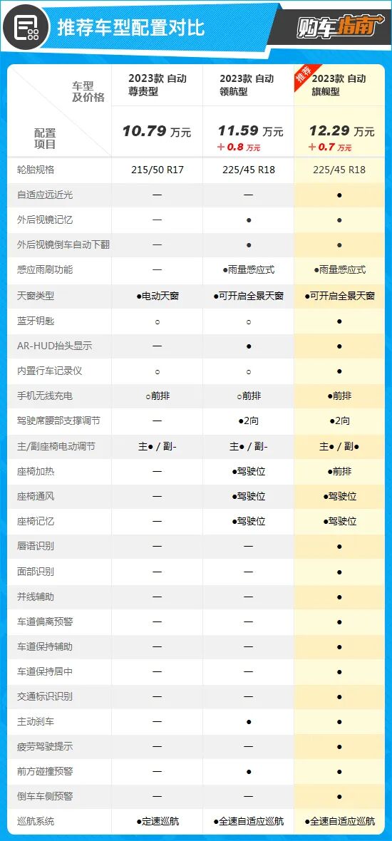 自动领航型仅搭载了少量驾驶辅助功能,虽然升级到全景天窗,并且增加了座椅加热通风、AR-HUD增强现实抬头显示等高阶配置,但以8000元的差价来衡量性价比依然不够出色,因此同样不做推荐。