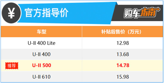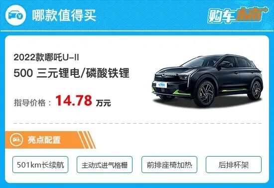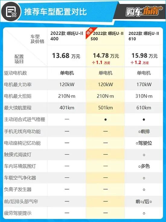 而对比高一级别的顶配车型,虽然再加1.2万元就能拥有610km的最大续航,但此时该车指导价已经来到了15.98万元,且两者配置保持一致,只是顶配车型多出了一些选装机会,性价比不足。另外,推荐车型因此,综上所述,如果您近期想购买2022款哪吒U-II车型,那么500系列车型相对性价比更高,在购车时可优先考虑。另外,500系列有三元锂电池和磷酸铁锂电池两种版本车型可选,两者配置保持一致,具体如何选择,看您个人意愿。