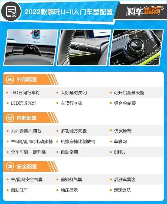 2022款哪吒U-II入门版车型整体配置表现中规中矩。首先,在外观部分该车全系标配了LED日间行车灯、LED远近光灯、车顶行李架以及可开启全景天窗等,整体外观可见的部分配置基本一致。不过相比于其它车型,入门级车型还是缺少了自动头灯、多层隔音玻璃、外后视镜加热/自动折叠以及电动感应后备厢等隐藏性的功能。