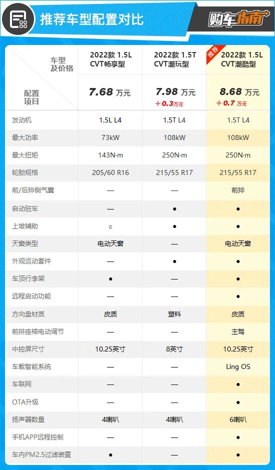 五菱星驰1.5T动力仅两款车型,所以选择就变得简单许多了。首先看潮玩型,不难发现整体的配置水平还是太低,塑料方向盘、没有配备天窗,车机也不支持网联功能,用车体验非常一般。在潮玩型的基础增加7千元,可以升级到潮酷型,对比潮玩型,潮酷型明显补齐了短板,而且在内饰质感、便利性、科技体验以及安全性都有明显升级,此时可以享受到较好的用车体验。虽然这款车型是全系最顶配,但考虑到其售价仅8.68万元,依旧能体现出不错性价比。综上,如果您对五菱星驰持币以待,那么潮酷型是车质网最推荐您购入的选择,购车时可以优先直接考虑。