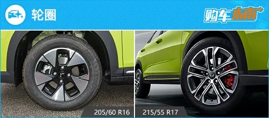 五菱星驰提供有两种不同规格不同样式的轮圈。除顶配和次顶配车型外,皆采用16英寸三角矩形样式轮圈,匹配具体规格为205/60 R16的轮胎;顶配和次顶配车型采用17英寸双条幅轮圈,搭配采用红色刹车卡钳,视觉更具运动感,轮胎规格为215/55 R17。