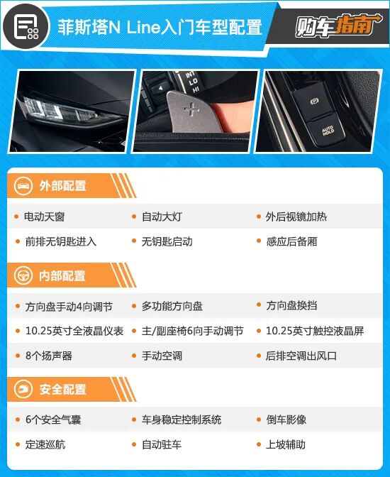 菲斯塔N Line入门车型精英版售价为13.88万元,如此价格对于一款合资品牌紧凑型轿车来说并不便宜。配置部分,入门车型在被动安全、基础功能方面表现可圈可点,像6个安全气囊、倒车影像、前排无钥匙进入、多功能方向盘、自动大灯均没有缺席,并且还提供了同级别不多见的感应后备厢功能,便利性不错。不过,在主动安全、多媒体、座椅以及空调方面,入门车型的表现有些不尽如人意,缺少了前/后驻车雷达、智能网联系统、前排电动座椅、车载空气净化器等实用功能。考虑到入门车型售价已经接近14万元大关,但整体配置水平并不理想,因此不建议购买。