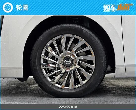 轮胎方面,广汽传祺M8宗师系列全系均搭载宗师专属星浮轮毂+MASTER悬浮立标,轮胎尺寸均为225/55 R18,与整车搭配显得十分协调。