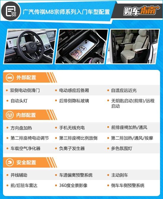 此外,新车尤为看重车内舒适性,前后排座椅均配备加热通风配置,而后排座椅还进一步配备按摩功能,对家人/客户的舒适性照顾十分到位。与此同时,诸如方向盘加热、手机无线充电、车载空气净化器以及多色氛围灯等高阶配置也均有所配备。安全配置更是直接拉满,并线辅助、车道偏离预警系统、主动刹车、前/后驻车雷达、360度全景影像等均有所配备。总的来看,广汽传祺M8宗师系列入门车型的整体配置表现出色,值得您优先考虑。不过,除了推荐入门车型外,下面这款车型也同样具有不错的性价比。