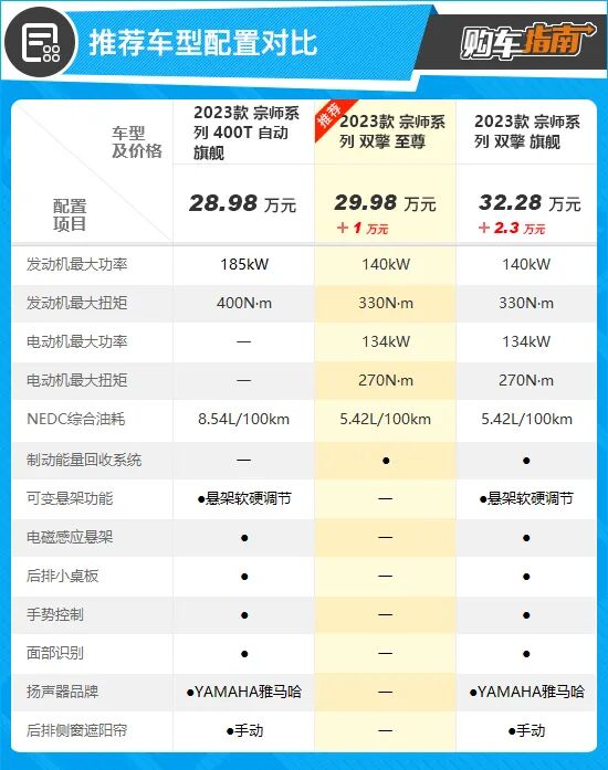 推荐车型相较低一级别而言,虽然取消了电磁感应悬架、后排小桌板等配置,但这些功能对于家用来说并非是刚需,不如选择丰田混合动力系统来的实在。而高一级别车型既是满足了双擎动力又拥有上述功能,但售价还需再加2.3万元,性价比并不高。因此综合来看,如果您正在关注2023款广汽传祺M8宗师系列,那么入门版车型和双擎至尊车型值得您优先考虑。