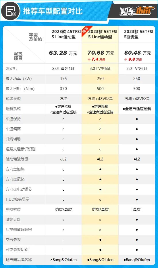 其它配置方面,推荐车型还比入门车型多出了可调节软硬及高低的空气悬架系统、方向盘加热/记忆功能以及B&O扬声器,这样的高端舒适性配置还是非常值得选择的,要知道,光一套空气悬架和一套B&O扬声器就要小5万块钱了,7.4万中余下的钱再为多出的动力买单,这是很公道合理的价格,并且奥迪进店就会有着程度不同的优惠,真正的终端价格还会更好。