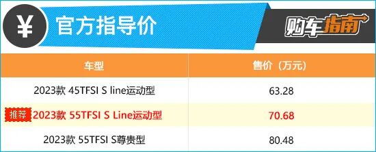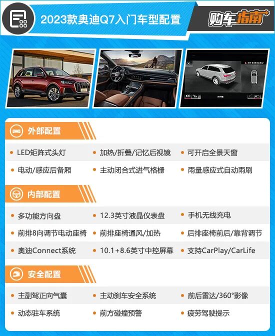 在刚上市的3款2023款奥迪Q7车型中,售价63.28万元的2023款 45TFSI S Line运动型为入门车型,其实在一些基本配置方面,它的表现已经不错了,像360°影像、座椅通风/加热,主动刹车安全系统等,都是比较实用的配置。但作为一款售价超60万的豪华品牌中大型SUV来说,一些进阶配置还有些薄弱,并且发动机的动力也略低一些,因此不作为主要推荐。