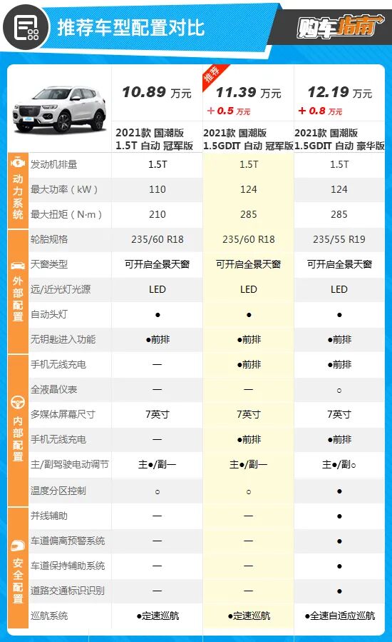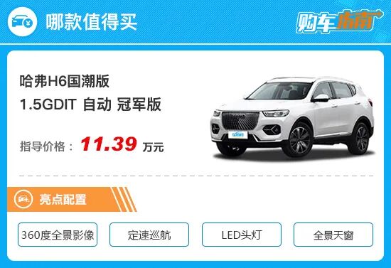 从价格与配置分布来看,哈弗H6国潮版 1.5GDIT自动冠军版,成为全系中最值得推荐的车型。推荐车型搭载了诸如360度全景影像、真皮方向盘、LED远近光等高端配置。相比1.5T低功率车型,推荐车型主要的改动是更换了1.5T高功率直喷发动机,5千元差价在日后使用中能获得更好的驾驶体验,除此之外还增加了手机无线充电功能,结合11.39万元的价格,性价比可谓是全系最高,故给出最佳推荐。